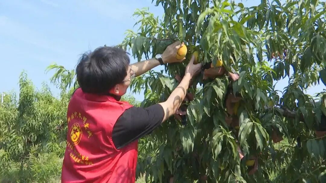 艳阳高照,知了声声。一大早,农场青年职工杨政熙就和队友们一起来到桃林,帮桃农义务采摘黄桃。今年是他当“黄大圆先生”的第二个年头,每到丰收时节,采摘圆滚滚的黄桃就成为了他最甜蜜的“事业”。放眼望去,蓝天、绿树、黄果和红马甲,让这片桃林更加地五彩斑斓。