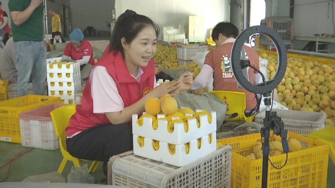 在黄桃打包车间,果香四溢,果农繁忙。一旁,志愿者“甜脆香小姐”黄晓娟正在进行线上直播,对着镜头娴熟展示黄桃的打包和销售。屏幕上的订单提示音与她的讲解声相互交织,成了车间里最鲜活的背景音。