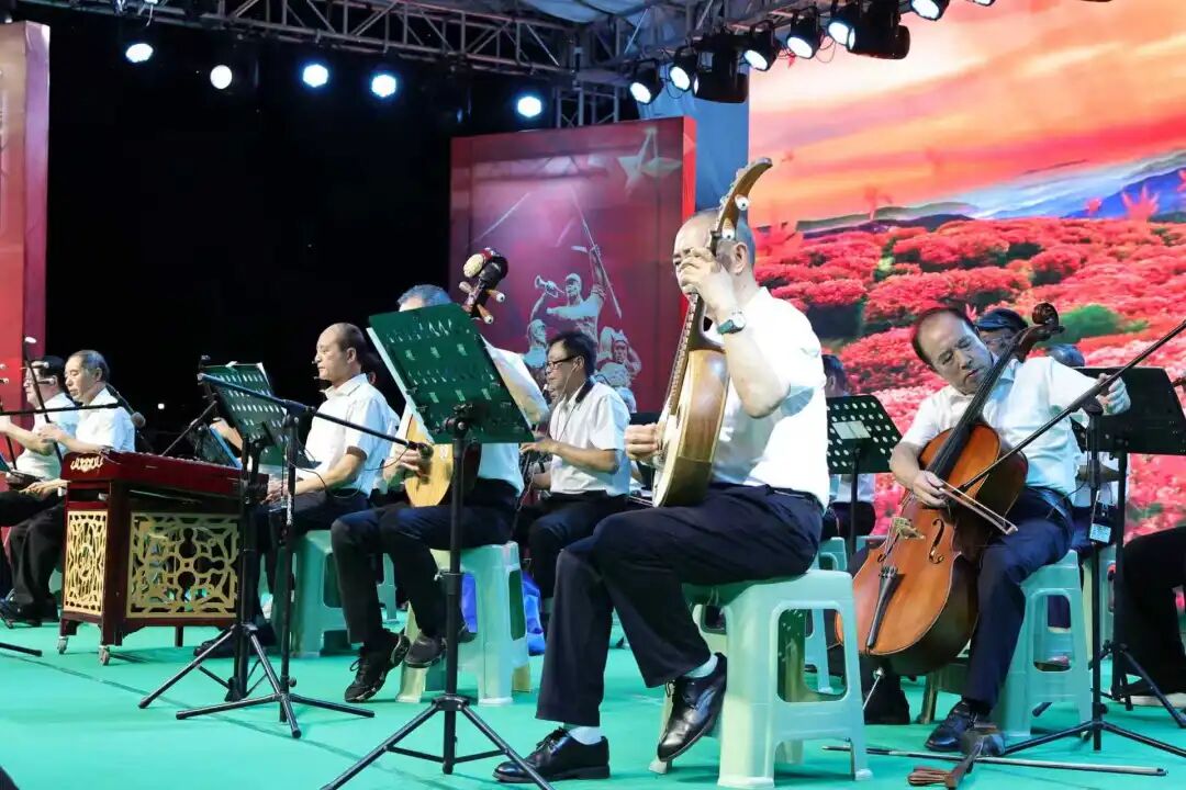 演出在民乐合奏《山丹丹开花红艳艳》《大别山上杜鹃红》中拉开帷幕,县文化馆民乐团以激昂的旋律唤起观众对革命岁月的深切回忆。